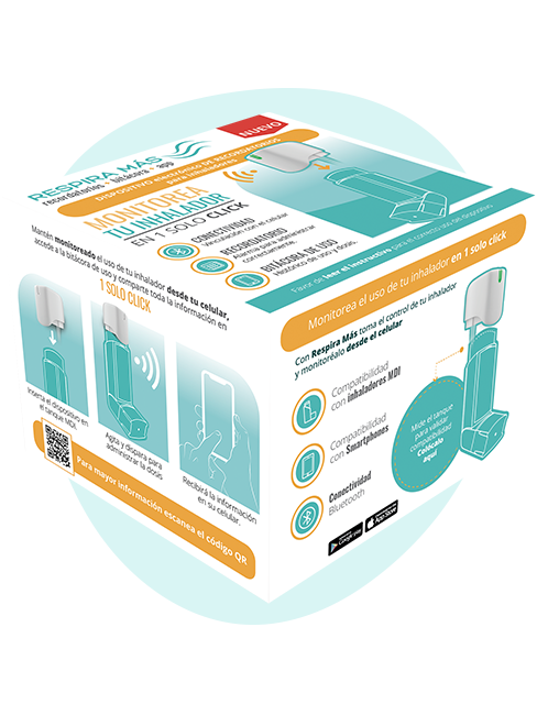 El dispositivo Respira Más® viene en una caja individual que contiene: 1 Dispositivo electrónico compatible con inhaladores tipo MDI y 1 Instructivo de uso. El inhalador tipo MDI no viene incluido. Iva incluido.