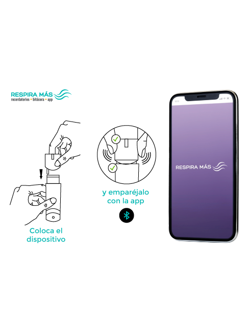 El dispositivo Respira Más® se coloca en el inhalador para monitorear cada vez que se utiliza y si se utiliza de manera adecuada.